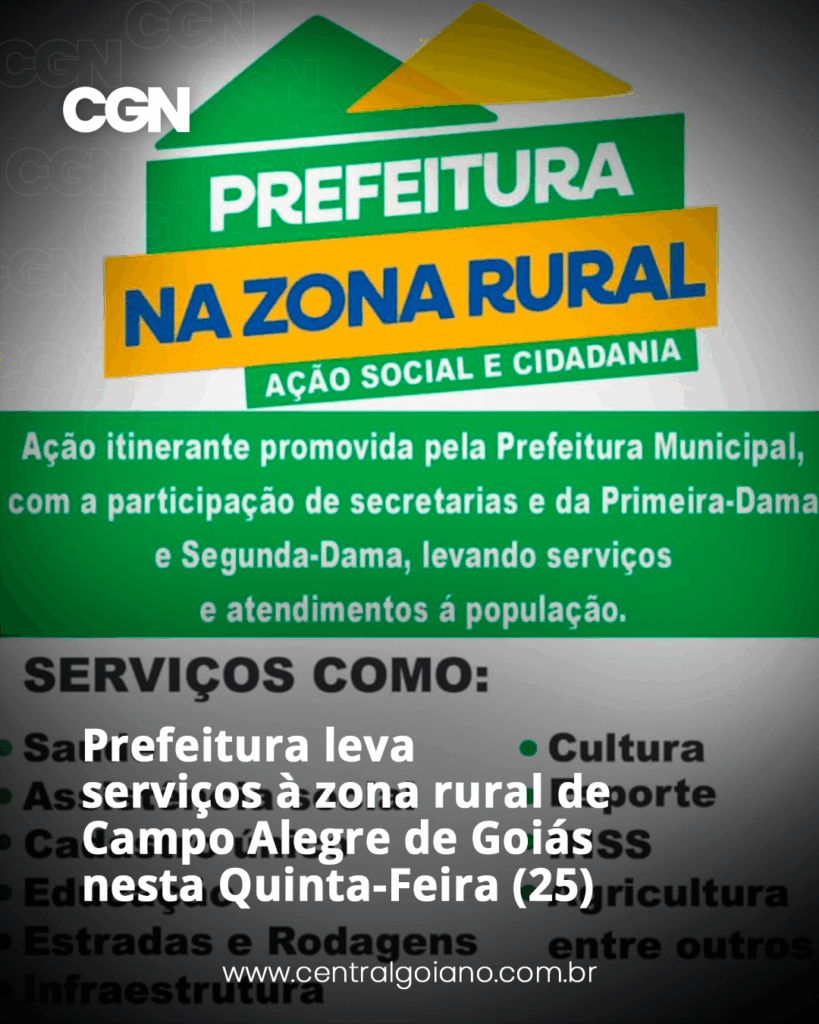 Nesta quinta-feira (25), a Prefeitura de Campo Alegre de Goiás realiza mais uma edição do programa Prefeitura na Zona Rural – Ação Social e Cidadania. O evento acontece no Centro Comunitário da Soledade, a partir das 13h, oferecendo serviços gratuitos à população rural. Estão disponíveis atendimentos de saúde, assistência social, cadastro único, cultura, agricultura, infraestrutura, além de orientações do INSS. A iniciativa conta com o apoio de diversas secretarias municipais e da participação da Primeira e Segunda-Dama. O objetivo é aproximar os moradores da zona rural dos serviços públicos, promovendo inclusão e qualidade de vida.